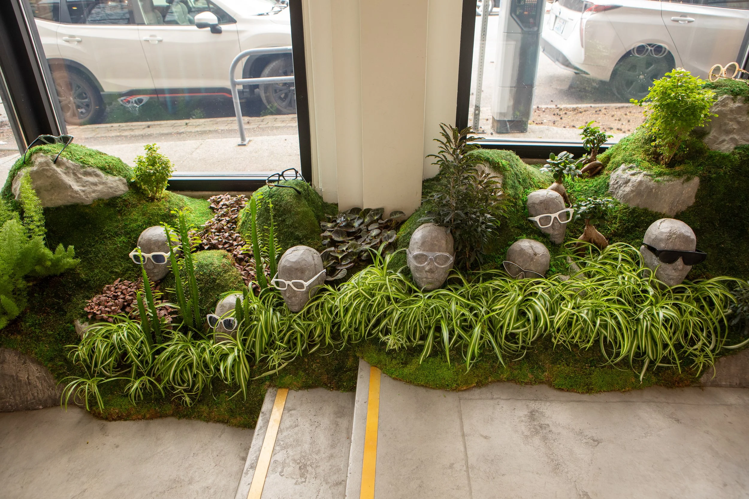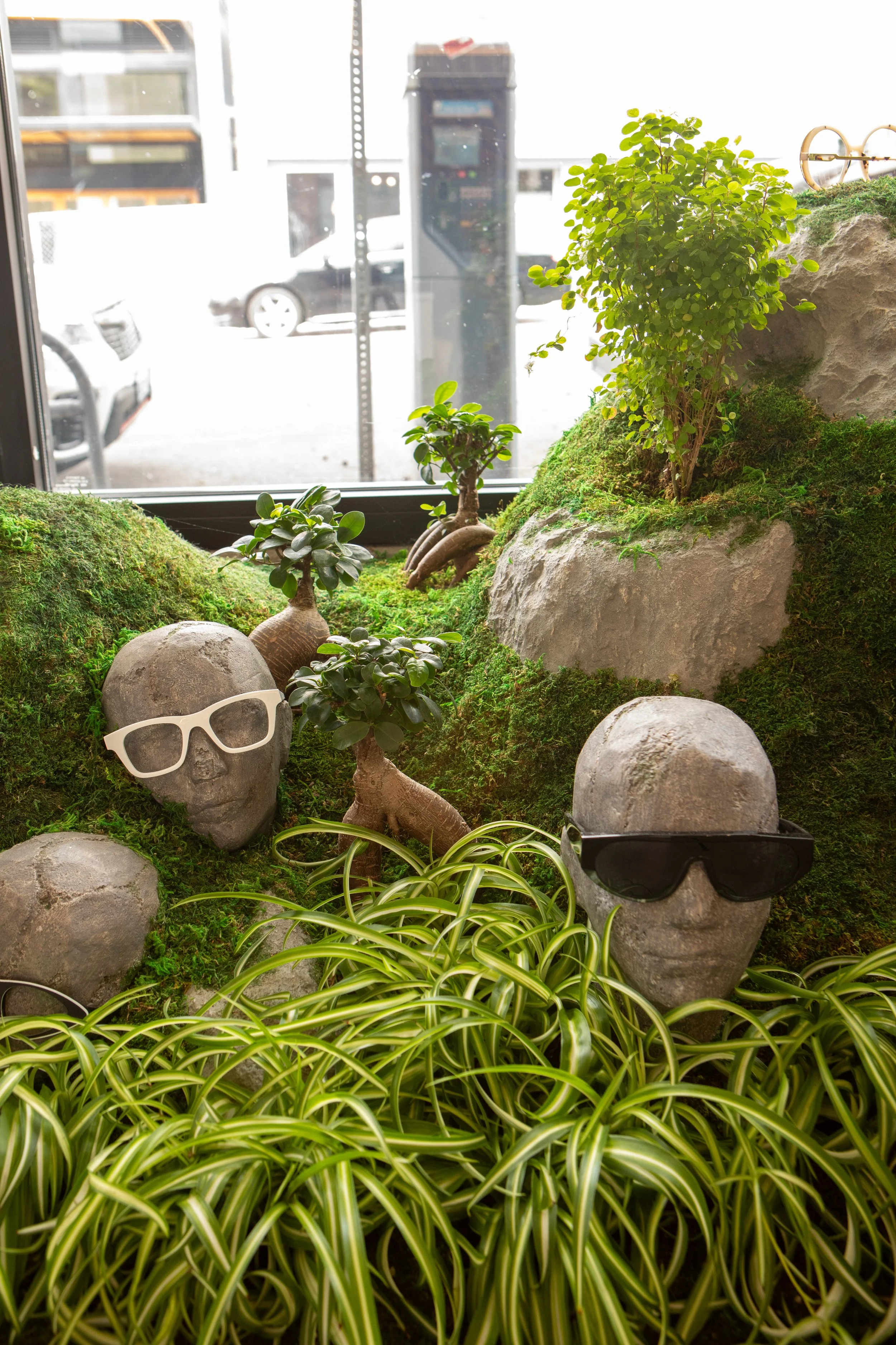 A built-in landscape was created for this hip optical boutique. Faux rock, preserved moss, concrete heads and petite specialty specimens overlap on this rolling groundscape-as-merchandising-moment.