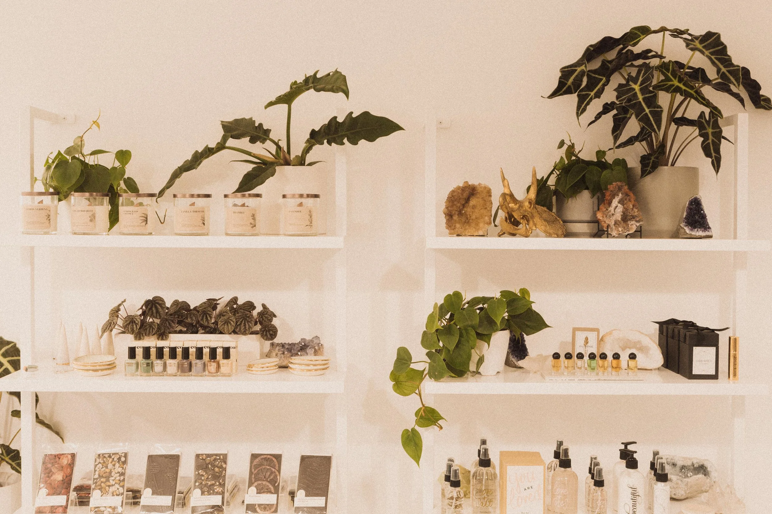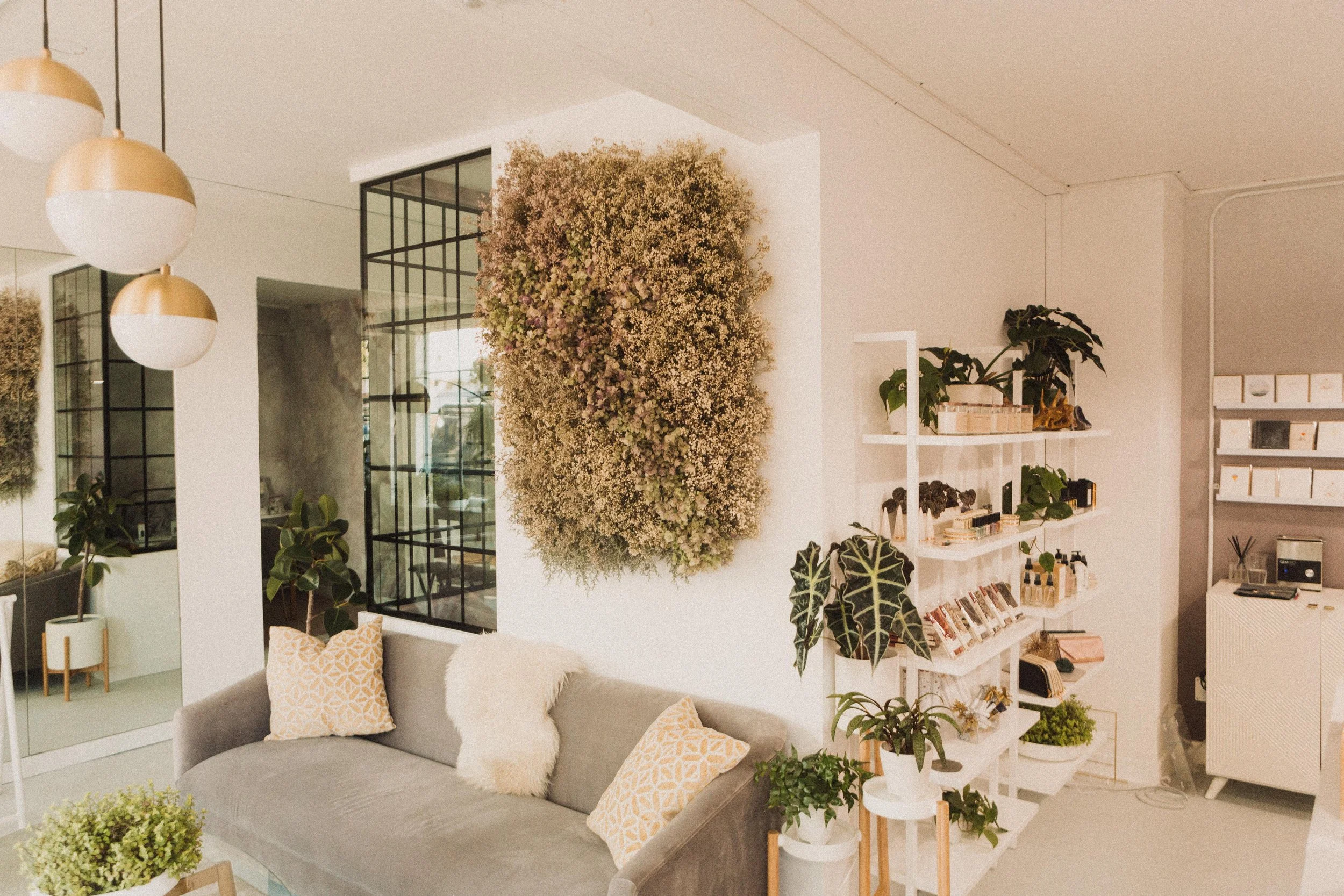 Soft botanical touches were added to this Jewelers store front. Custom wall art was created from dried florals, while potted plants with unique leave shapes were woven throughout merchandising moments.